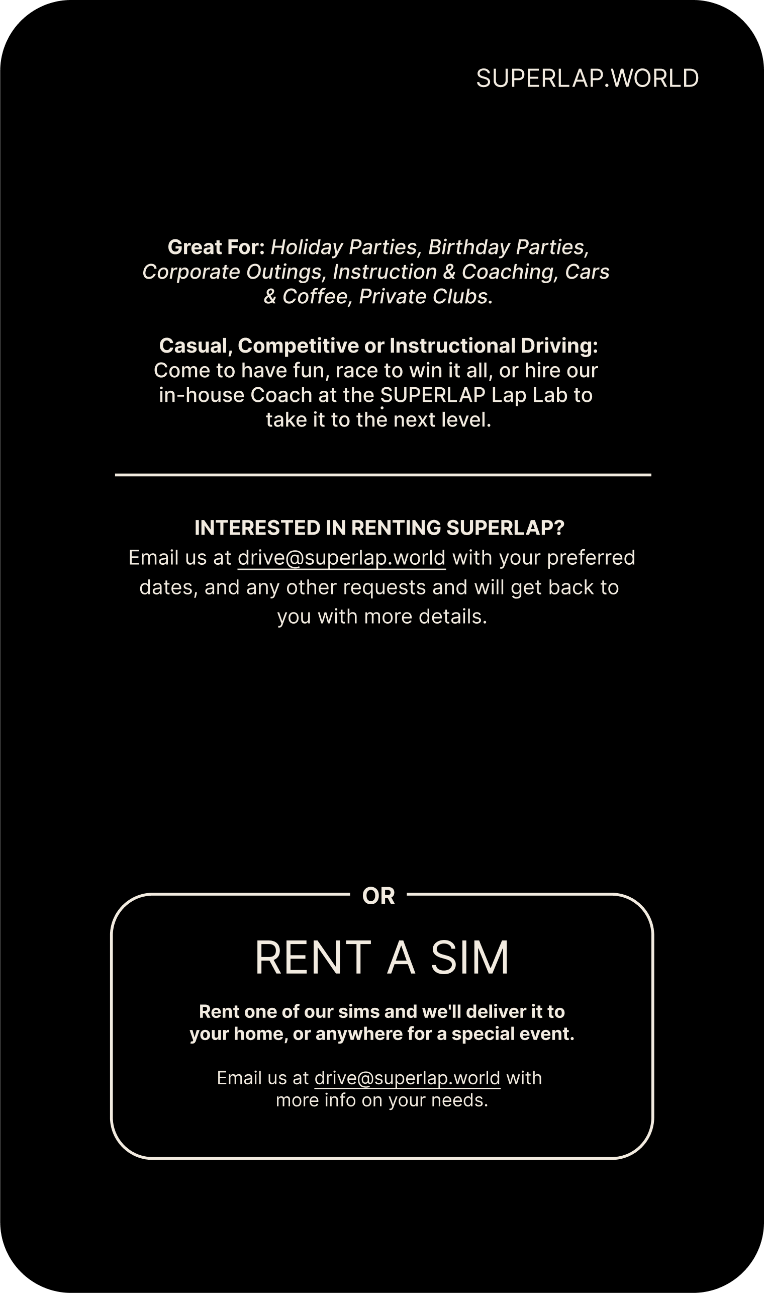 SUPERLAP is available for private bookings or sim rentals.
